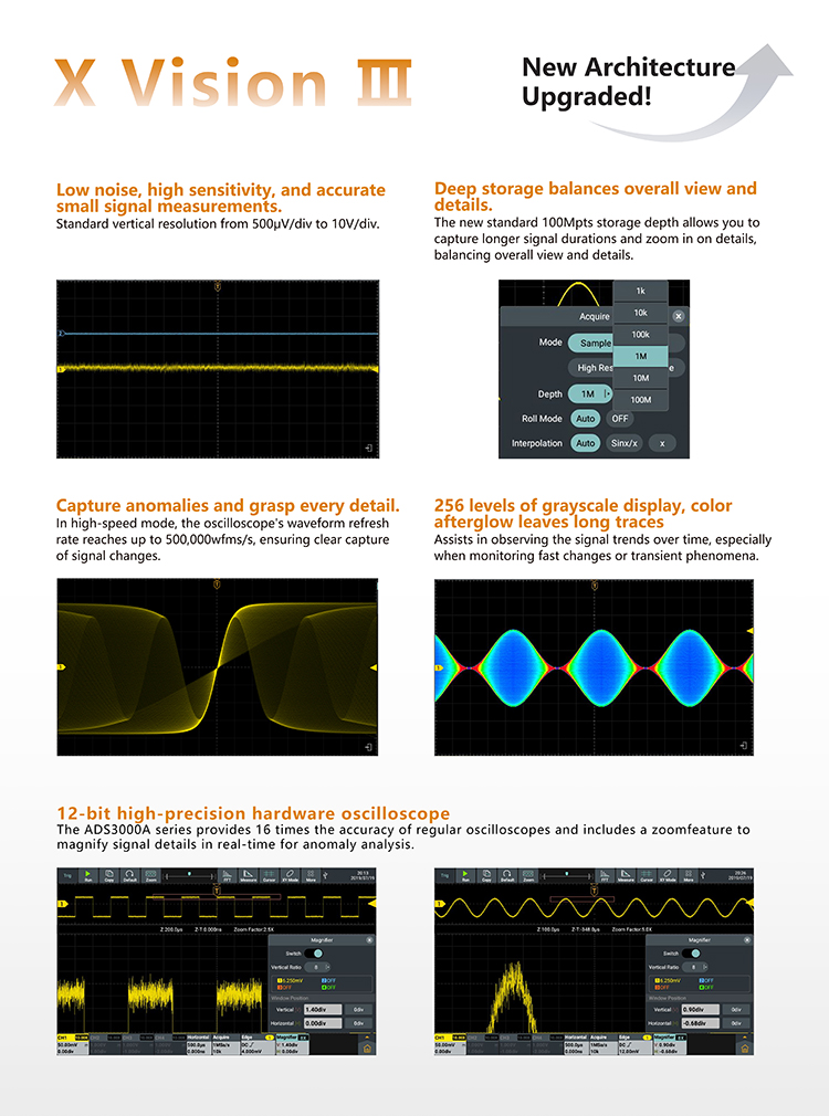 100M Record Length, up to 500,000wfms/s waveform refresh rate.