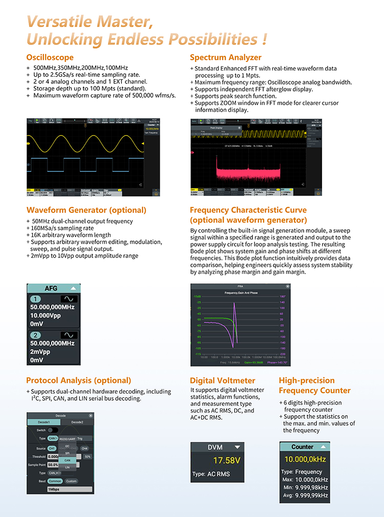 100MHz-500MHz bandwidth, 2.5GS/s real-time sampling rate.