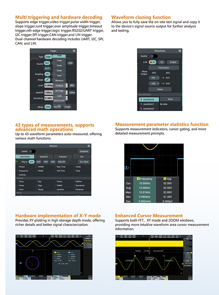 Multi triggering: edge, video, pulse width, slope, under-amplitude,over-amplitude, timeout, Nth edge, logic and RS232/UART,l2C, SPI,CAN, LIN; 2-channel hardware decoding: UART, I2C, SPI, CAN, LIN.