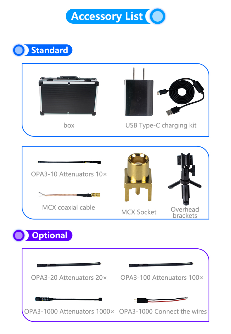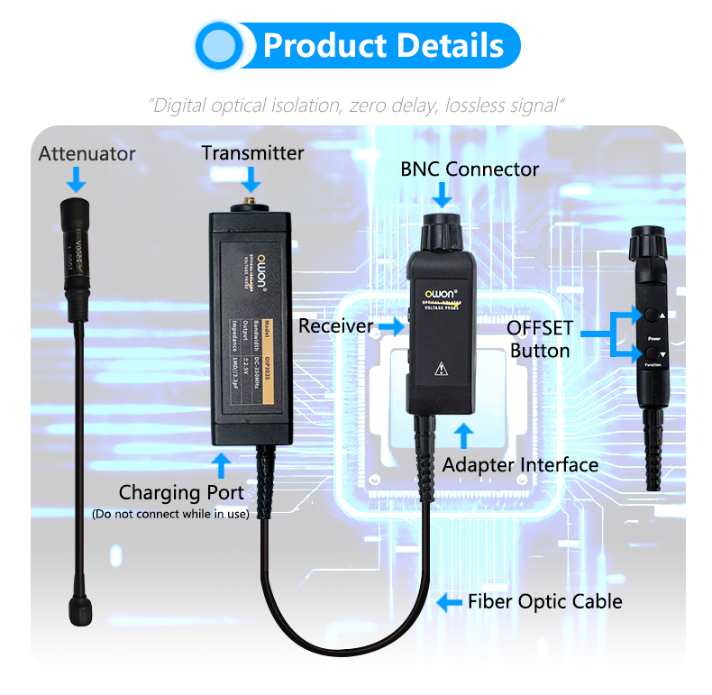 Measurement Voltage Range: OPA3-10 attenuator 10X(standard):±25V, OPA3-20 attenuator 20X(optional):±50V, OPA3-100 attenuator 100X(optional):±250V, OPA3-1000 attenuator 1000X(optional):±2500V